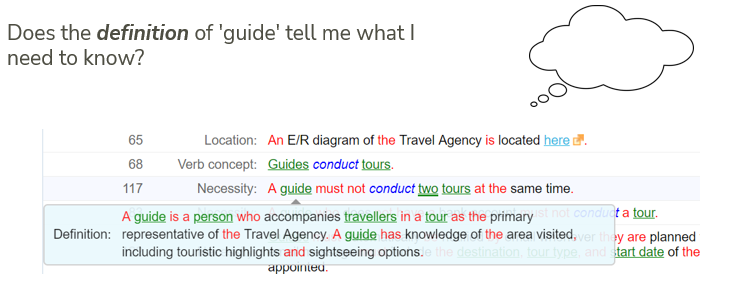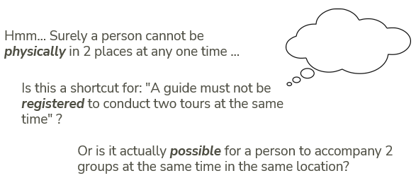 First, imagine that it has not been overlooked. The client's answer is that groups of travellers almost never spend the same time in the same place, and even if they do, a guide is never asked to take responsibility for multiple groups. In this situation, the rule is clearly not about business reality (guides cannot physically do different groups at the same time), so the intent of the rule is that the database software (the USoft application) that you are implementing must reflect this restriction to avoid registration errors: double-booking of guides at planning time. Now, a case could be made for rephrasing the rule, so that it talks explicitly about software and no longer about business reality: