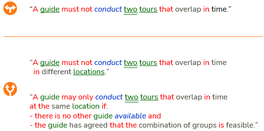 Now imagine a different situation. The dialogue with your client reveals that it is undesirable, but not impossible, that a guide takes responsibility for multiple groups in the same location at the same time. It could be undesirable because this is more difficult for guides to do well, or because it entitles them to extra pay. This discovery would lead to rule refinement. In this particular case, it could mean that the rule above the orange line is replaced by the 2 rules below the orange line: