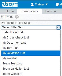 In USoft Studio, at the top of the FILTERS pane on the left, you can also filter at any time by subset of items that have certain flag settings. For example, if you ask for My Validation List, you get all the items that have Approved = No and Approved By = (your name). Click the question mark to the immediate right of the word 'FILTERS' for details.