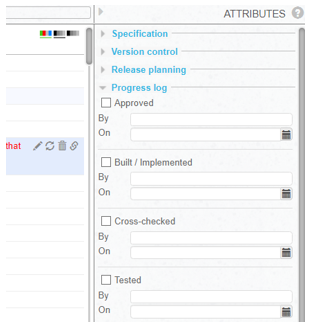 USoft Studio has a set of progress flags. They are checkboxes that optionally allows your team to keep track of who defined, approved, built/implemented, cross-checked, tested, and documented an item.
