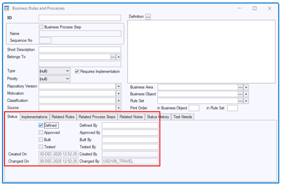 In USoft Teamwork (part of USoft Definer), the Business Rules window has progress flags on the Status tab. These correspond to the main flags in USoft Studio: