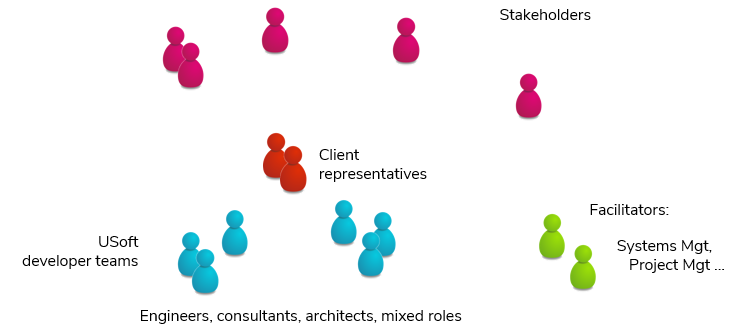 Developer team members include a wide variety of professionals: engineers and programmers; consultants, architects and business analysts; testers and documentation specialists; and people in mixed roles. USoft aims at horizontal teams where members can step in and help each other out as much as possible, while each team member also has his specialisations and strong points. Teams are typically small: 2-5 members. USoft has software tooling that makes it easier to split large projects into multiple sub-projects, each with its own small team. This tooling includes features for Modular Development; Repository Management, Object Shopping, and Delivery Management.