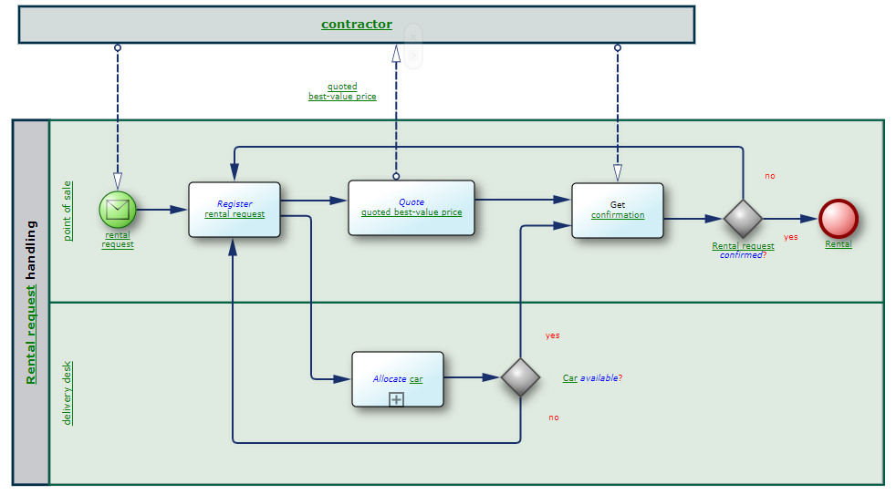 Diamond shapes called gateways show points where the process can go multiple ways depending on some outcome or decision. For example, the "Car available?" gateways tests whether the delivery desk was actually successful in allocating a rental car. If it was not, the step during which the rental request is registered must be redone. Exactly what this entails is not explicit - apparently it does not involve re-contacting the contractor because there are no connecting arrows with the contractor box at this point.