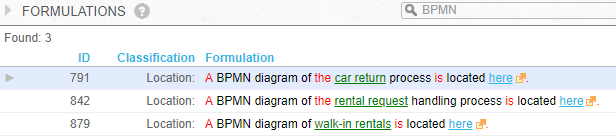 As you can see, a BPMN diagram is characterised by boxes connected by arrows pointing mostly in a left-to-right direction. Each diagram in USoft Studio is mapped to a formulation. If your project has a BPMN diagram, you can find it by finding the formulation that represents it, and then clicking on the "here" link in that formulation. Formulations representing BPMN diagrams often actually talk about BPMN diagrams, in which case you can easily find them by searching for the letters 'BPMN':