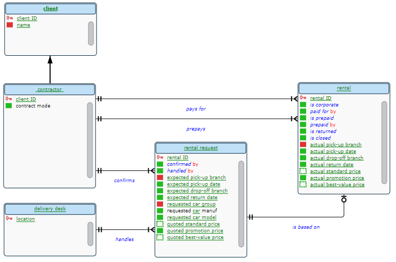 This example favours a naming style. The foreign key in "rental" indicating which contractor pays for the rental is named "paid for by". The advantage of this style is that USoft Studio automatically links this column name to the "contractorpays forrental" verb concept, as you can see when you hover the text "paid for by", and also when you click on it. It is also possible to call the foreign key (for example) "contractor ID". This has different advantages.