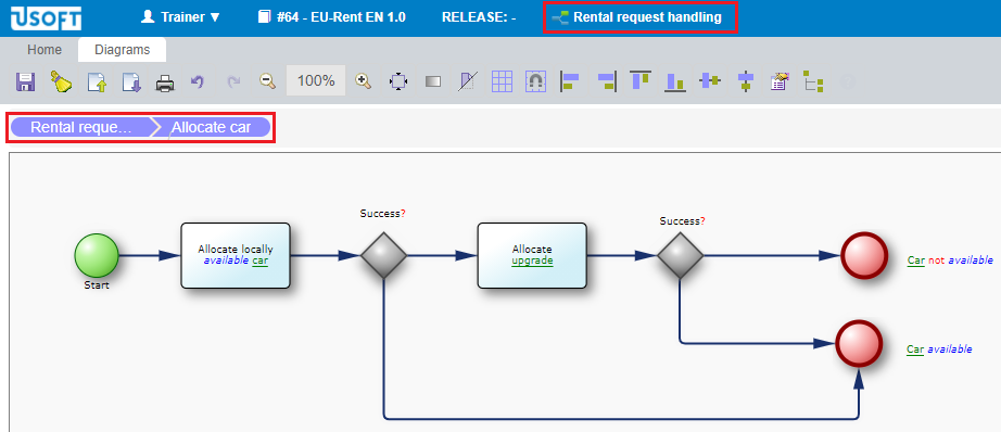 The two elements highlighted by red boxes help you in this navigation. The diagram name in the header bar is still the name of the main process that you "came from": this stresses that you are viewing not another main process, but the details of a particular area of the first main process. The "breadcrumbs" control in the top left corner visualises the path that brought you to where you are. If this subprocess has its own subprocesses (not in the picture), you could go there and the breadcrumb control would show 3 steps instead of 2. You can click on the first step of the breadcrumb control to navigate back to the main process.