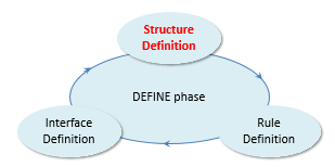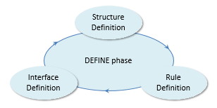 The subphases of the DEFINE phase are Structure Definition,  Rule Definition and Interface Definition: