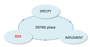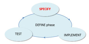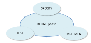 The tasks to be completed in the DEFINE phase are SPECIFY,  IMPLEMENT and TEST: