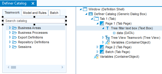To see a demonstration of how this works, use the "Search catalog” box at the top of the catalog tabs in USoft Definer, for example, the Teamwork catalog tab: