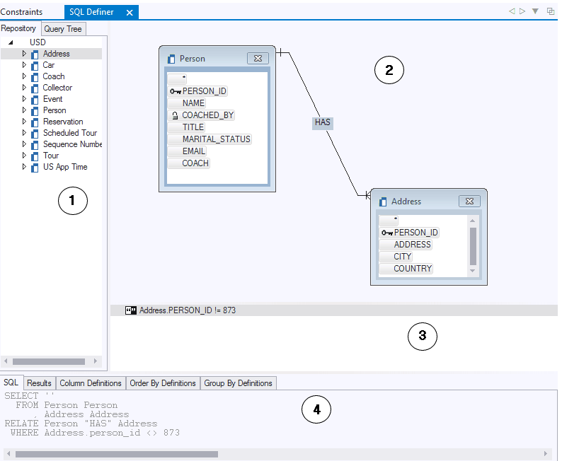 The SQL Definer window consists of four panes, which can be opened/closed by means of the Show menu. In the illustration above these panes have been marked (1) - (4 ) to help identify them.