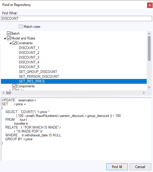 If you double-click an item in the tree view, the definition window for that item will be displayed. In the example illustrated above, double-clicking on SET_RES_PRICE opens the constraint definition window for the SET_RES_PRICE constraint. You can restrict the search area by unchecking boxes in the tree view before pressing the Find All button. Only those areas for which the checkbox is checked will be searched. You can toggle the setting of the checkboxes using the mouse, or the keyboard space bar. The dialog is dockable.