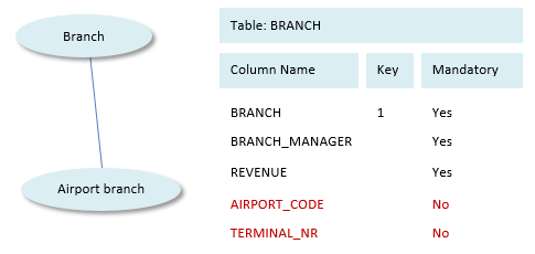 In this setup, you can add a BRANCH_TYPE column that you allow (typically through allowed values at domain level) to be set to either 'CITY_AGENCY', 'AIRPORT_BRANCH', or 'HOTEL_DESK'. You can then write constraints such as the following, which enforce that Airport Code and Terminal Number are specified for airport branches but not other branches: