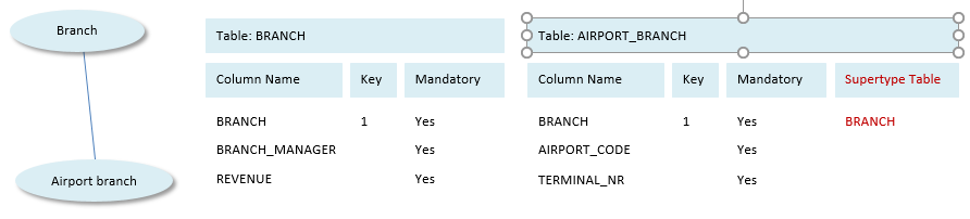 You can model subtypes by creating relationships where subtype information is in the child table. The primary key of the relationship is the primary key of the supertype table. The foreign key of the relationship is the primary key of the subtype table. If the concept is a "true" subtype, then each Branch is allowed to be an Airport Branch only once, so the relationship must have the Maximum Children = 1 setting. This time, the supertype characteristics Airport Code and Terminal Number are allowed to be Mandatory columns: