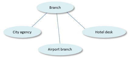 The 3 subtypes share common characteristics of the supertype, such as the fact that they have an address and a branch manager, but they also have characteristics of their own: an airport branch has a airport terminal where it is located, but non-airport branches do not.