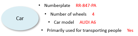 An individual vehicle could be identified, described and classified as an instance of the "Car" entity by assigning the attribute values of "RR-847-PA" to the attribute Numberplate, "4" to the attribute "Number of wheels", "AUDI A6" to the attribute Car Model, and "Yes" to the attribute "Primarily used for the transport of people" :