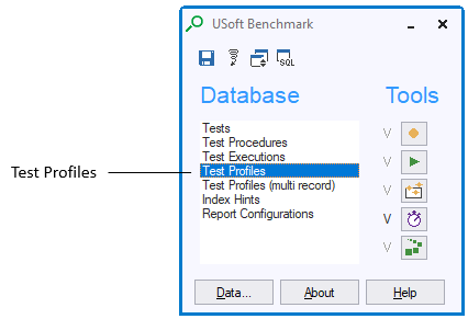 - In the USoft BenchMark toolbox, double-click Test Profiles in the Test Database list. The Test Profiles window appears.
