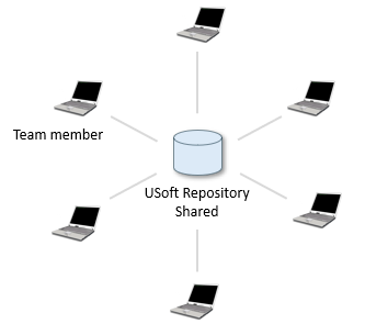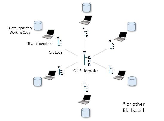 Your team can decide to bring this shared USoft development repository under a file-based version control system such as Git. In this arrangement, there is no central database. Instead, each team member holds his or her own local working copy of the USoft repository: