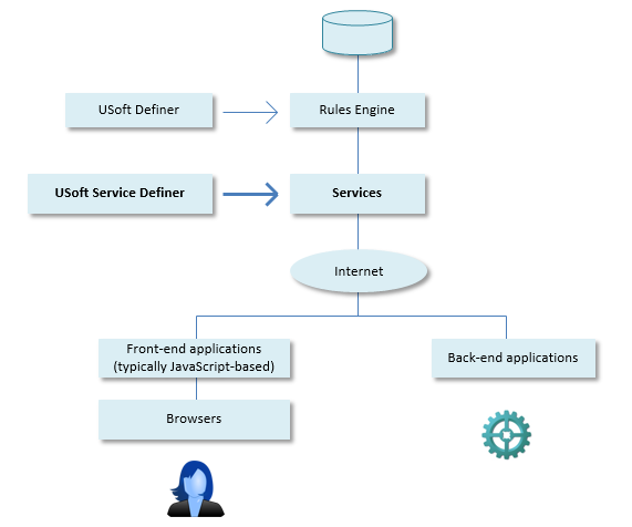 USoft Definer is the primary tool for creating a Rules Engine. USoft Service Definer is the primary tool for creating the service layer.