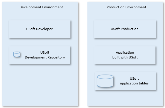 In a development environment, a team creates one or more USoft applications. In a production environment, a USoft application is accessed and used by runtime end users.