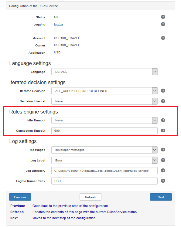 You can open a browser-based Rules Service configuration console at a ure.config URL, for example, by creating and then using a Rules Service item in a USoft Binder file. In this console, you can set Idle Timeout and Connection Timeout for a Rules Service: