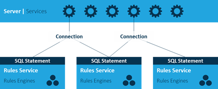 The purpose of a Rules Service is to enforce business rules, or business logic, when application data is manipulated, as well as to provide this rules-enforced data to external agents. This includes the enforcement of access rules or authorisation rules. The threads spawned by a Rules Service are called Rules Engines. Rules Engines connect to the RDBMS and execute data transactions on behalf of the Rules Service. They are the workhorses of the application and the layer where you are most likely to spend time analysing what needs to be done to improve performance.