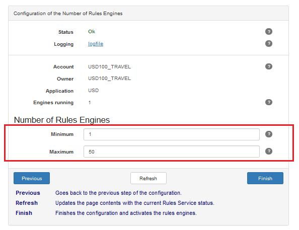 You can also set how many Rules Engines the Rules Service must spawn, by setting Minimum Number of Rules Engines and Maximum Number of Rules Engines. The number of Rules Engines per Rules Service must be between 1 and 50: