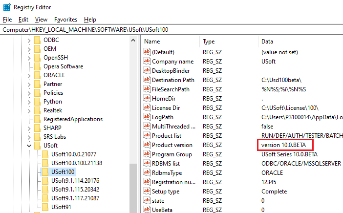 For each major release version, USoft Setup stores registry information for the most recently (or the only) installed patch under the name of the major version. Here is an example of registry keys for USoft 10.0.BETA: