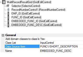 An embedded DataSource can be used as a kind of joined column, for example in a GridControl. This picture shows a GridControl object and a part of the Property Inspector for the GridCellControl with name EMBEDDED_FUNC_DESC.