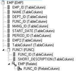 This picture shows an EMP (Employee) data source with an inserted FUNC1 data source with a Function ID and a Short Description: