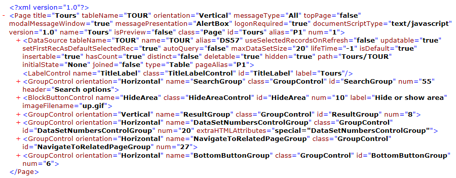 Here is an example of a part of an .XML file for a page based on a database table called TOUR.