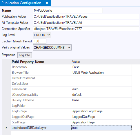 You can edit this list of property settings. The example shows a "useIndexedDBDataLayer" publication property that was added manually.