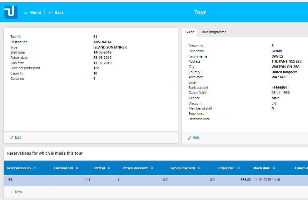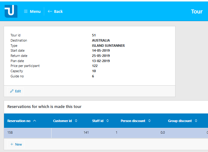 In the usoft-zero default, by default, each detail page for TOUR has a top pane for viewing all the information of the current tour, and a bottom pane with a grid showing the reservations made for the tour:
