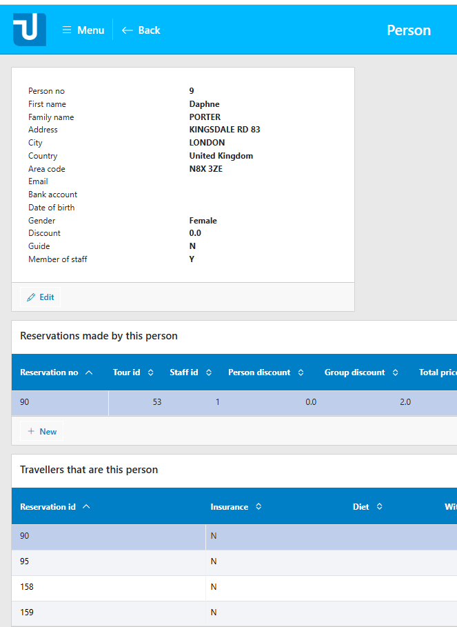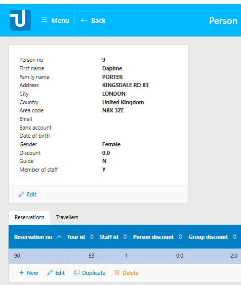 On this basis, you get a detail page for PERSON with 2 grid controls, one for Reservations made by the Person, and another for cases where this person appears as Traveller: