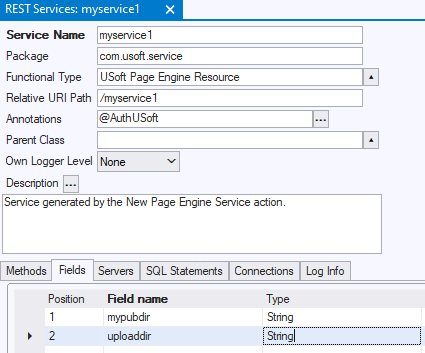 1. In Service Definer, add a new Field to the REST Service that acts as your application's Page Engine. Call this field by any name, for example, 'uploaddir'. For this new field, set Type =