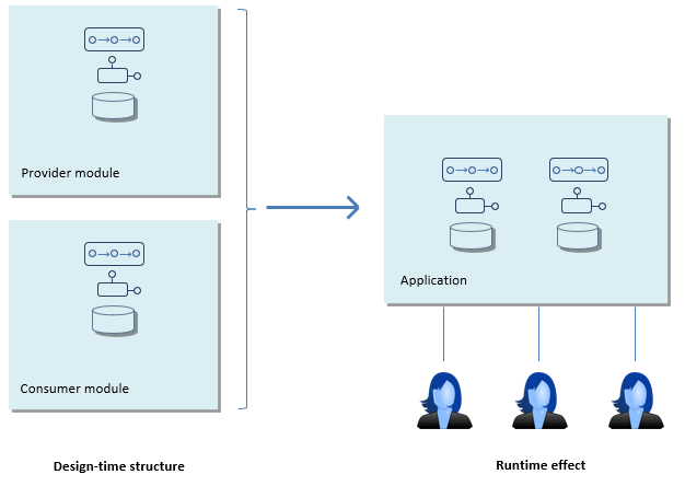 When you deliver an application with modules, the runtime effect is that the modules are combined. The boundaries between modules are no longer relevant at runtime. Users see a mix of resources from all modules included: