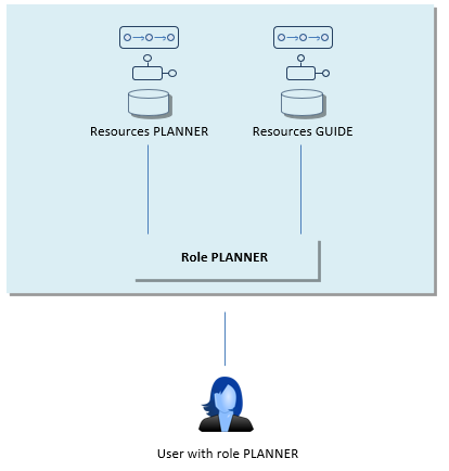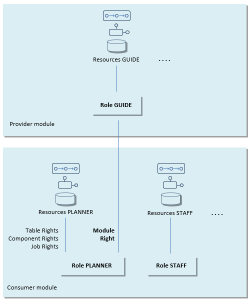 Here is an example design-time structure where role PLANNER not only has table, component and job rights, but also a module right for role GUIDE in a provider module: