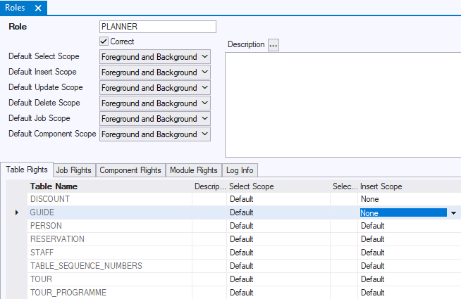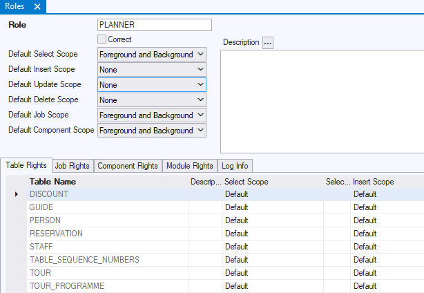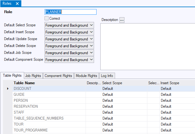 The picture shows a newly created role. You can see that, by default, a role has full access: all the tables have "Foreground-and-background" scope for all the access types (Select, Insert, Update, Delete). 3. If this is what you want, you are done. If you want to restrict table rights in some way, you now have a choice. If you want to make the same settings for all the tables, or nearly all the tables, then change the role-level defaults in the top of the window. In this example, the PLANNER role still has full read-only access, but no longer any other type of access to the tables: