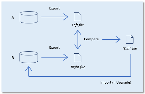 Using comparison, you can bring (upgrade) a repository B to the same state as another repository A. Export the contents of A as the left file. Export the contents of B as the right file. Execute the comparison. Import the resulting "diff" file into B: