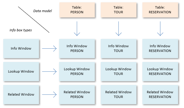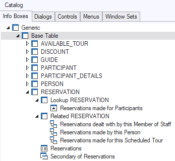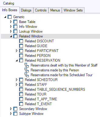 The catalog section below shows some classes inheriting from the Related Window info box class. As you can see, some of the classes that inherited from Base Table class "RESERVATION" are also inheritants of the Related Window info box type: