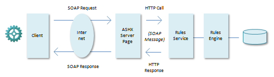 When publishing a web service by clicking the Create Web Service button on the Web Services (Provider) window, an ASP.Net HTTP Handler file with extension .ASHX and (if requested) a WSDL file are generated. The ASHX file represents the starting point (the access URL) for the published web service. The ASHX server page calls the Rules Service via the HTTP protocol in a SOAP format, and executes the SQL statement defined for a specific method. The response (if any) from the Rules Service is sent back to the client application.