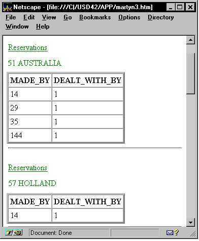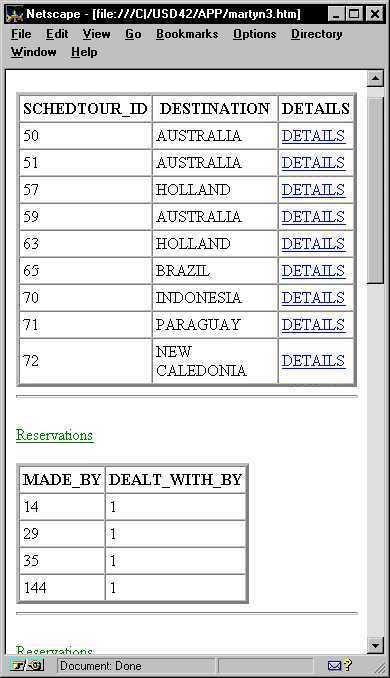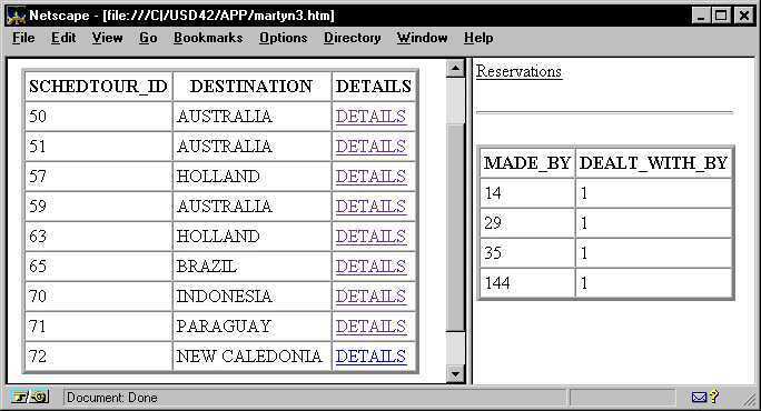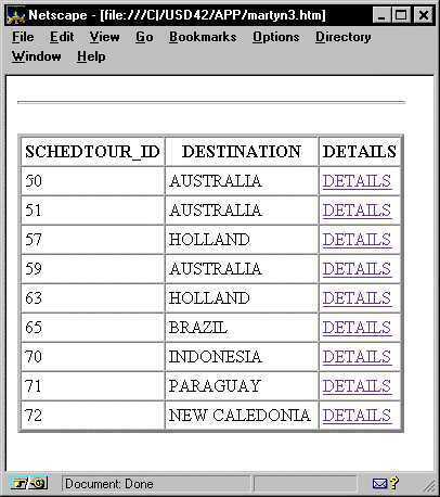 One document shows the parent information for each record. A link is added to a separate HTML document containing the child data. For example, the main document might look like this (assuming the default table layout has been used):